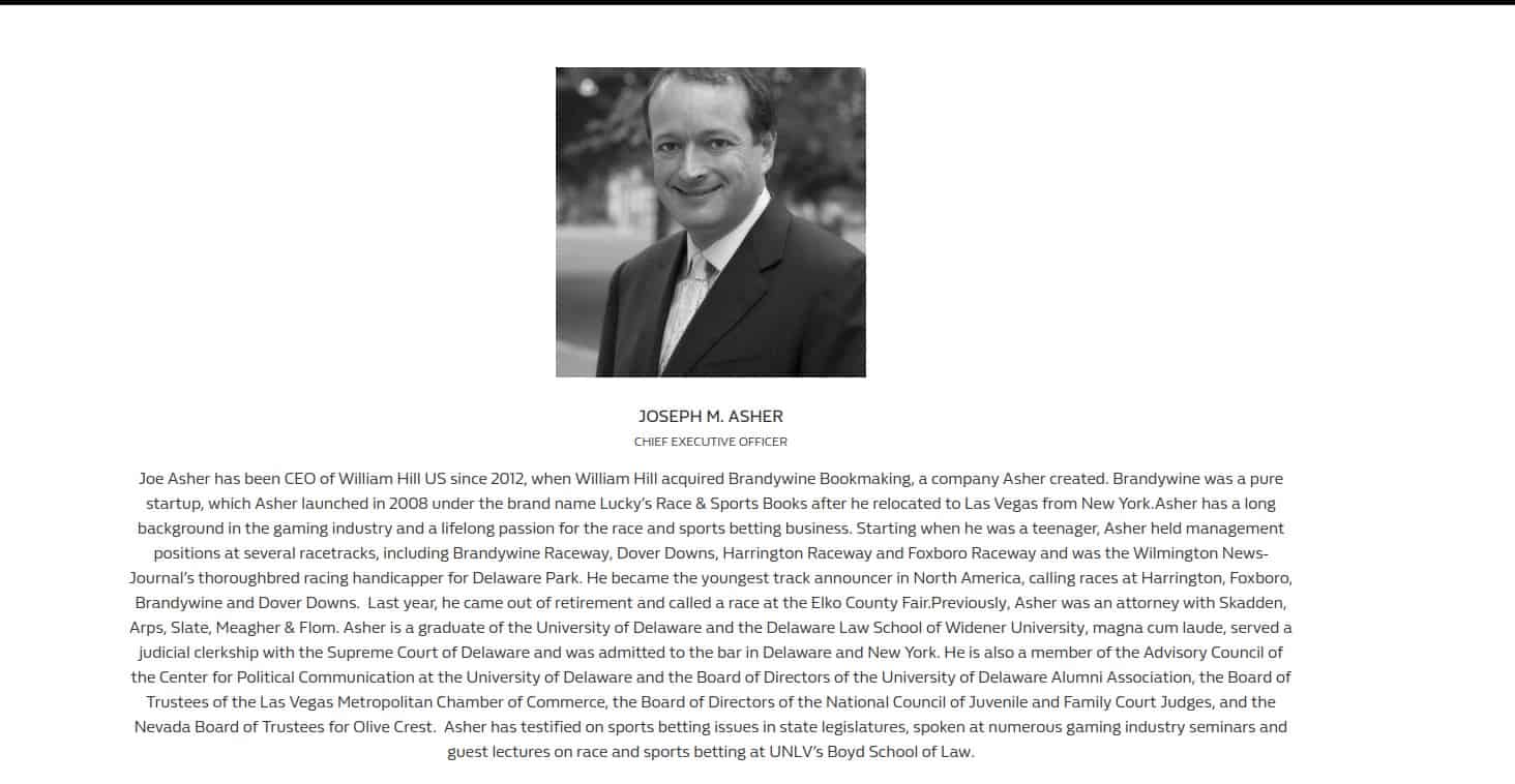 Asher has been CEO of William Hill US since the beginning and has been in the gaming industry all his life. There’s very likely more to this story than Asher is letting on and I’ll make him resurfacing in a new position and/or with a new sports betting related project within the next year a -250 favorite. As of the time of this article’s writing, Asher was still on the William Hill US website: