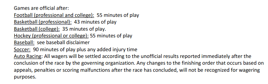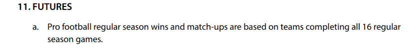 There is an interesting circumstance that could arise this year–the NFL is increasing the number of regular season games from 16 to 17. So what if a sportsbook forget to change this in their house rules? In most cases, it wouldn’t matter. The sportsbook has a wide latitude to interpret their rules and in the case of an obvious error like this the ‘intent’ is clearly that teams must play a full schedule of games. Most jurisdictions give the book power to amend the house rules, even after the fact. Once again, this is from the Betfred Sports Colorado house rules: