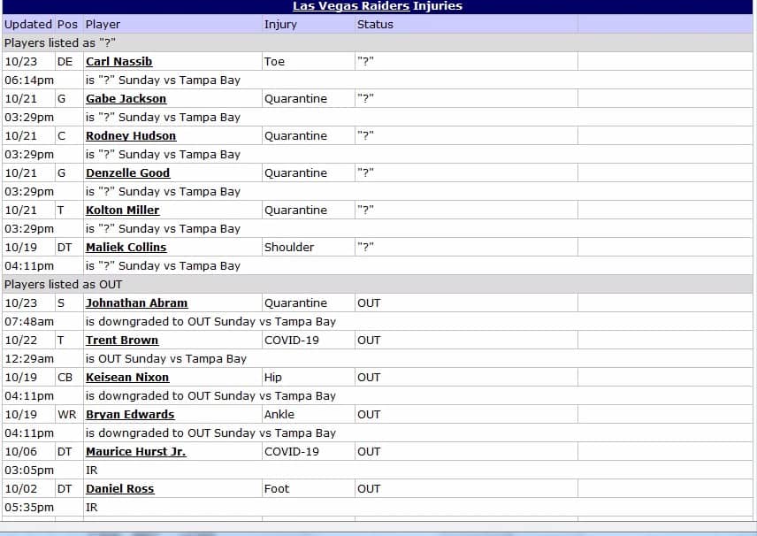- Las Vegas Raiders’ right tackle Trent Brown has tested positive for COVID-19 and is listed as OUT for Sunday’s game against Tampa Bay.