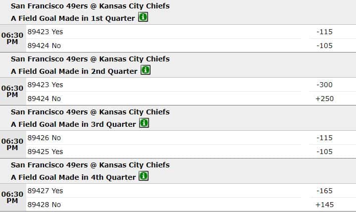 Both offenses are incredible at moving the ball in their own way, but they are also going up against pretty stout defenses. I don’t think this is going to be a game of all touchdowns, so getting on field goals in the second and fourth quarters makes the most sense. Again, you have to go with your gut and predict scenarios on how you think the game plays out. If you have a hunch that both teams drive or struggle in certain quarters, you may want to put some money on both teams not hitting a field goal in the first.