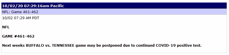 “The Pittsburgh-Tennessee game scheduled for Week 4 will be rescheduled to later this season after one additional Titans player and one personnel member tested positive for COVID-19 today. An announcement of the new game date will be made shortly.”