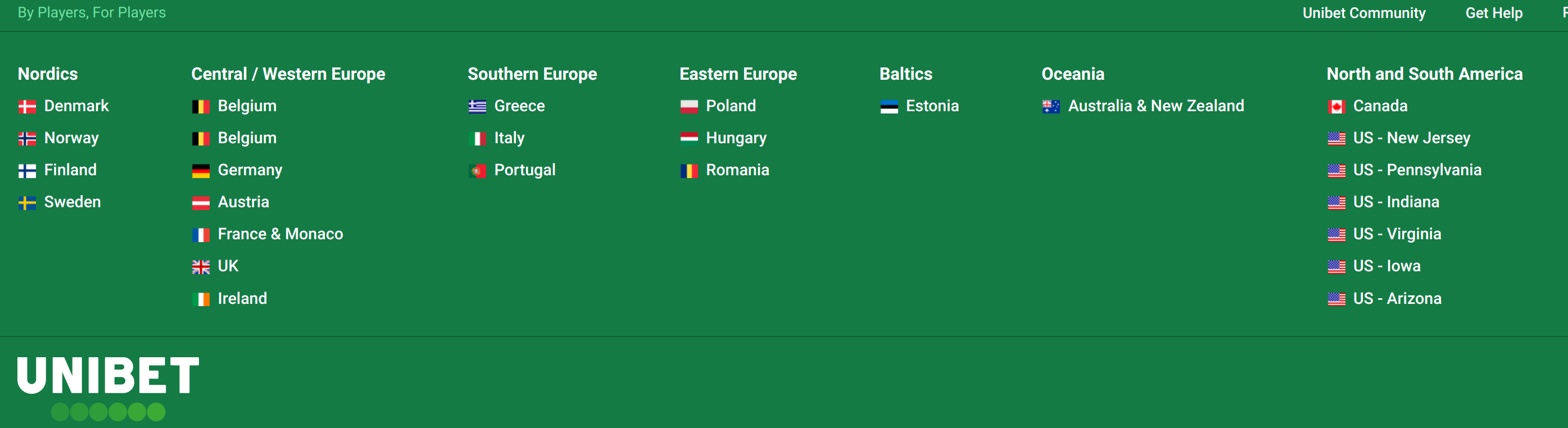 UNIBET ONTARIO: Unibet is owned by Malta based gaming giant Kindred Group. They’re huge in Europe and own a total of nine sports betting/casino brands including 32 Red. If you’re a fan of the English Premier League you’ve probably seen the 32 Red logo–at various points in the past few years they’ve sponsored Leeds United, Aston Villa, Derby County, Preston North End and Middlesbrough. Unibet is also a well established European brand and the marquee that Kindred has chosen for their North American expansion. They’ve served Canada for awhile and will continue to do so after migrating all Ontario based customers to their newly regulated site. In the US, they have online and/or retail service in New Jersey, Virginia, Pennsylvania, Indiana, Iowa and Arizona. This screenshot from the Unibet website should give you some idea of the company’s international reach: