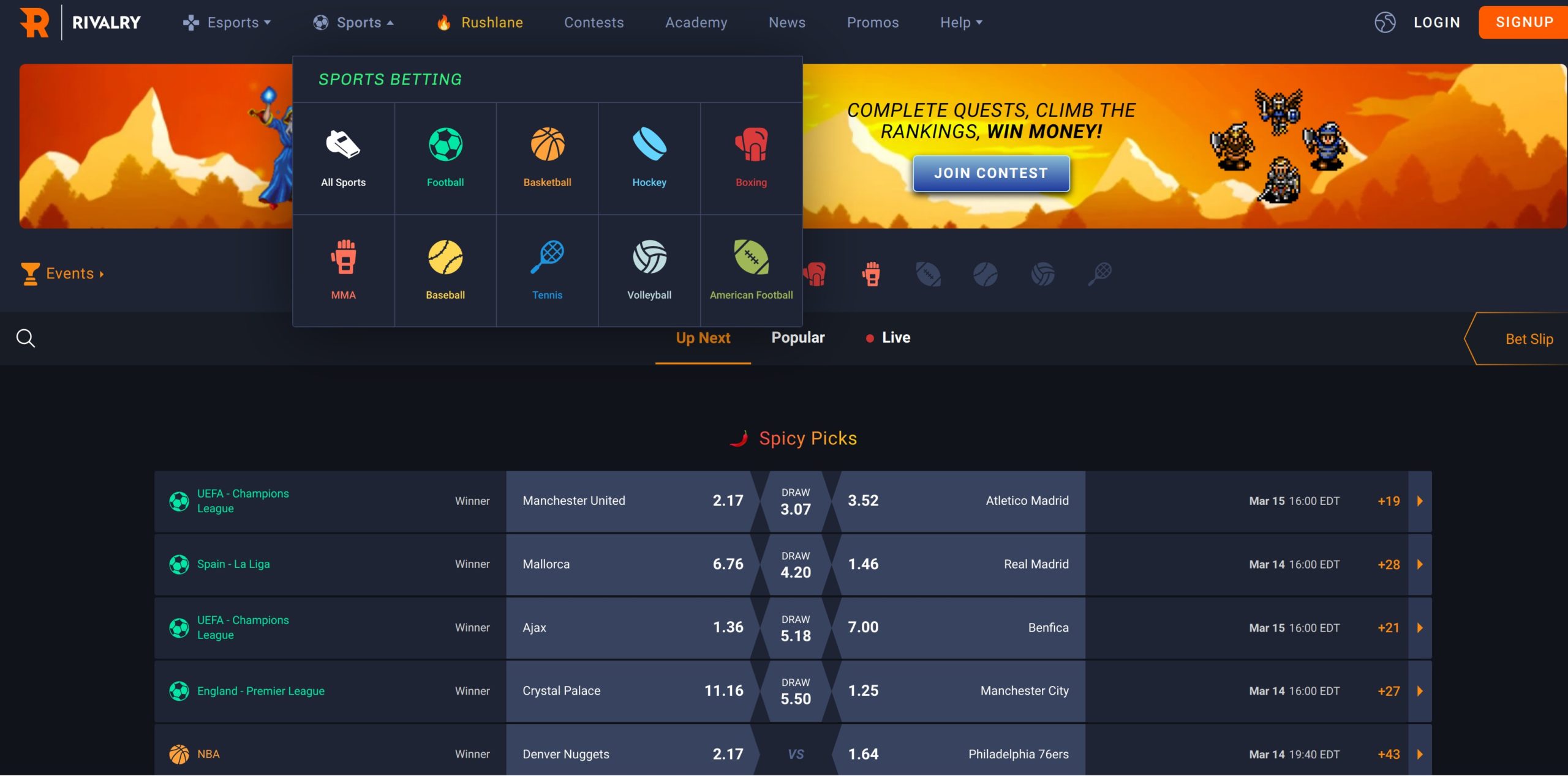 Rivalry is clearly an esports focused betting platform though they also offer wagering on ‘traditional’ sports. They’ll be doing a similar mix in Ontario though I’m assuming that they’ll emphasize the mainstream sports a bit more (eg: hockey). At least that’s how I’d play it. No indication about whether they’re planning to do casino games but why wouldn’t they? Here’s the current Rivalry website at rivalry.com. Depending on where you are, it may be geo-blocked but I’m accessing it from Kansas City, Missouri (one of the real underrated cities in the US BTW) without a VPN: